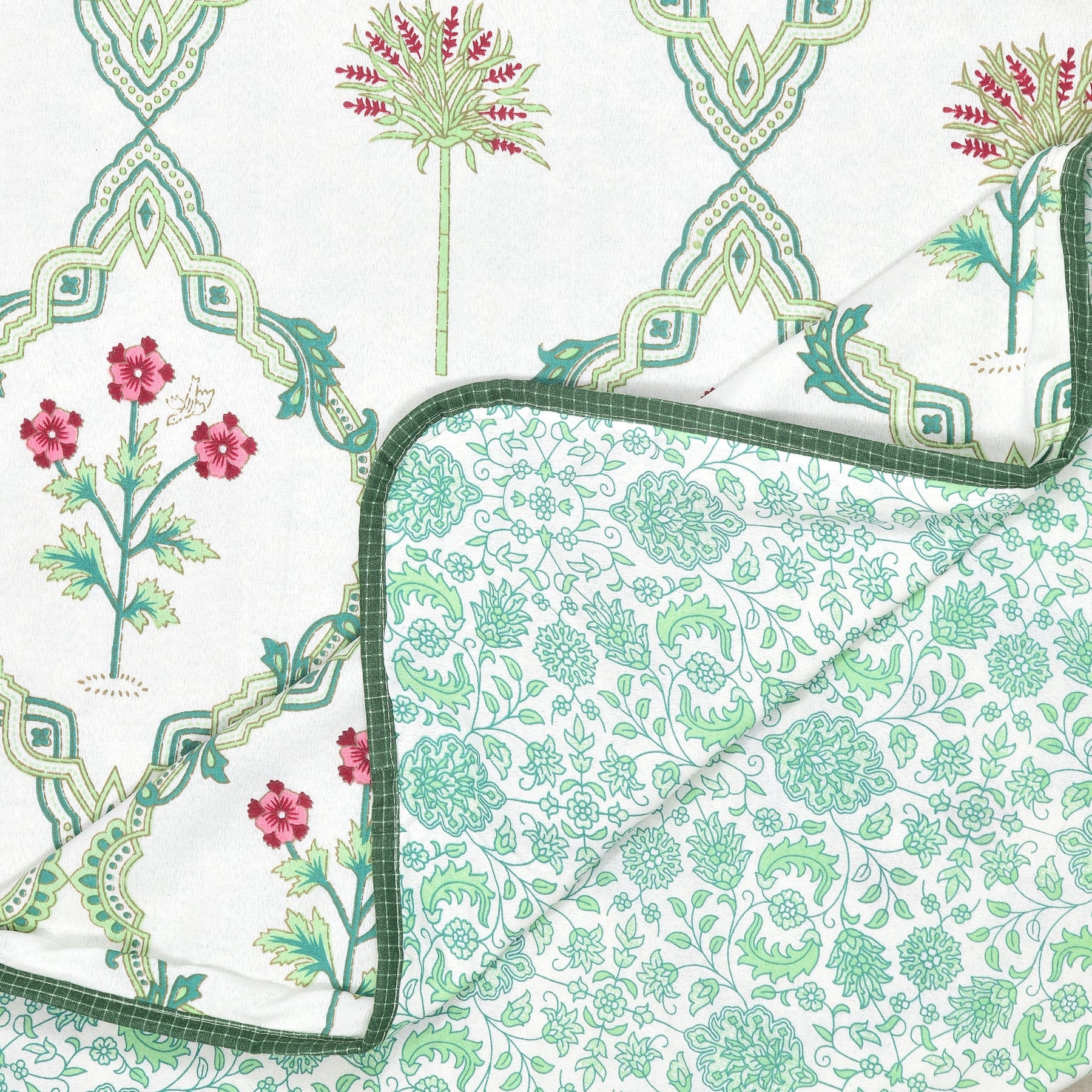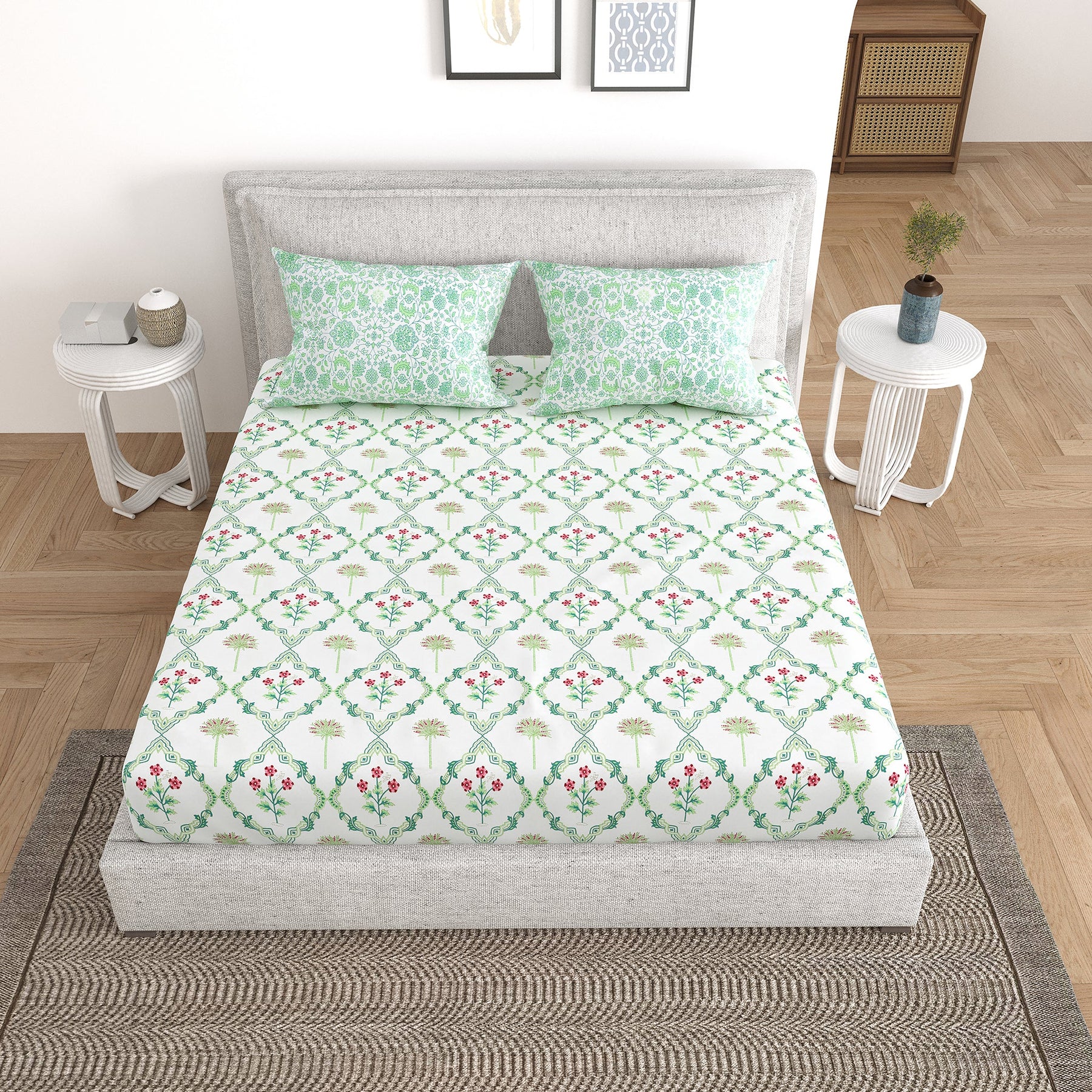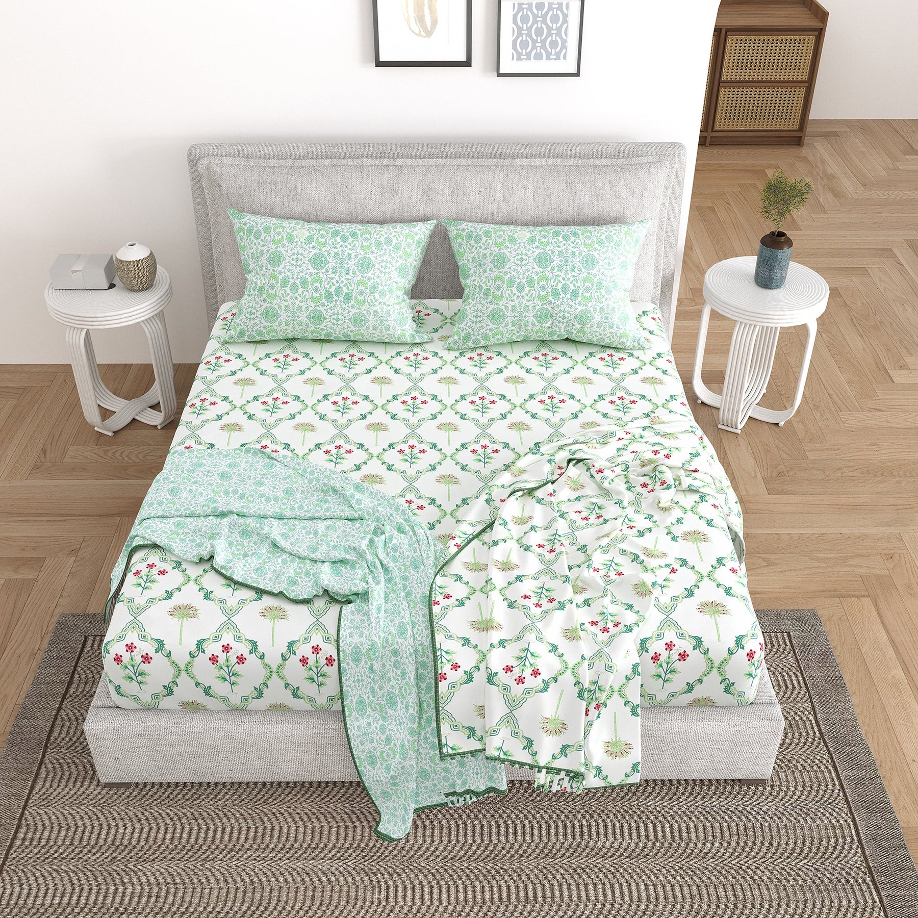 5 PC Bedding Set ( 1 Double Bedsheet with 2 Pillow Covers & 2 Reversible Single Dohar ) Floral Design Cotton Green Colour - Oasis Bedding Set