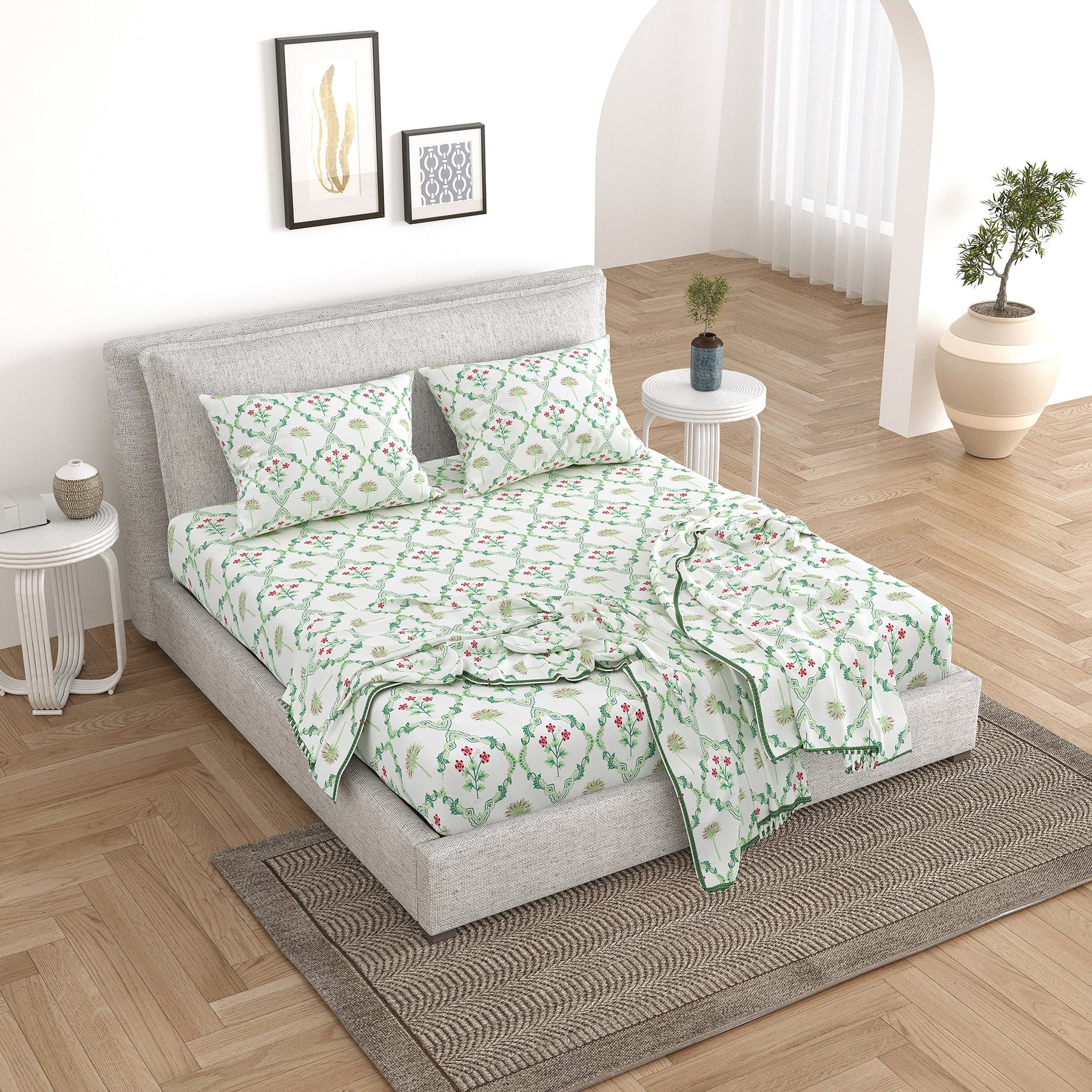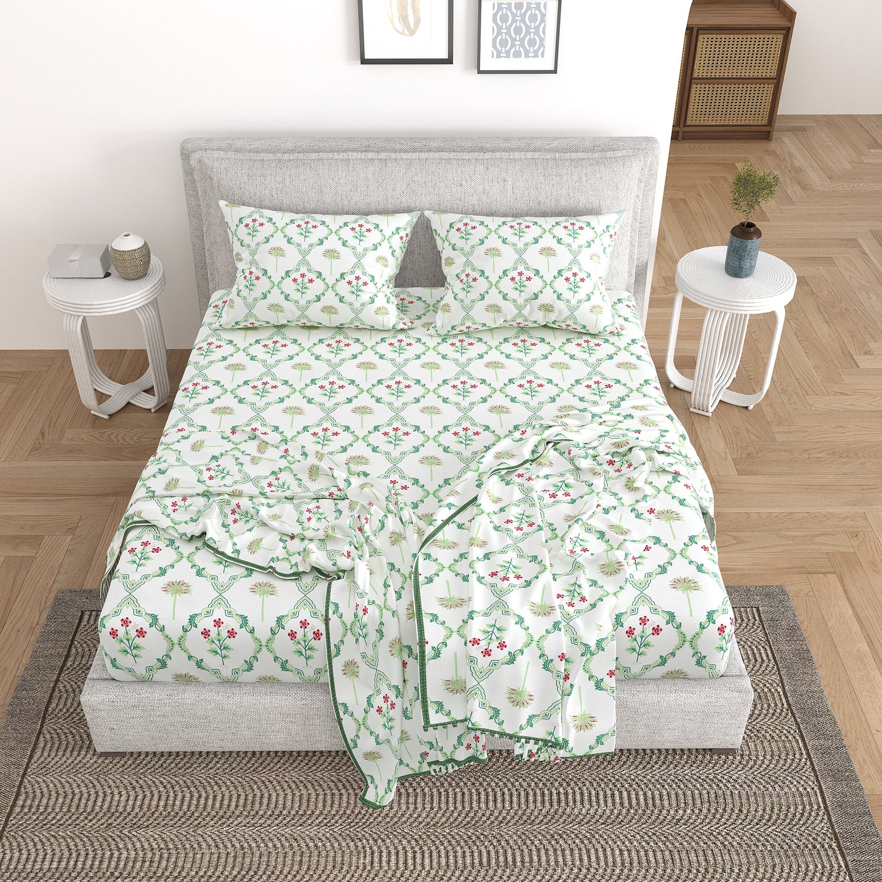 5 PC Bedding Set ( 1 Double Bedsheet with 2 Pillow Covers & 2 Reversible Single Dohar ) Floral Design Cotton Green Colour - Oasis Bedding Set