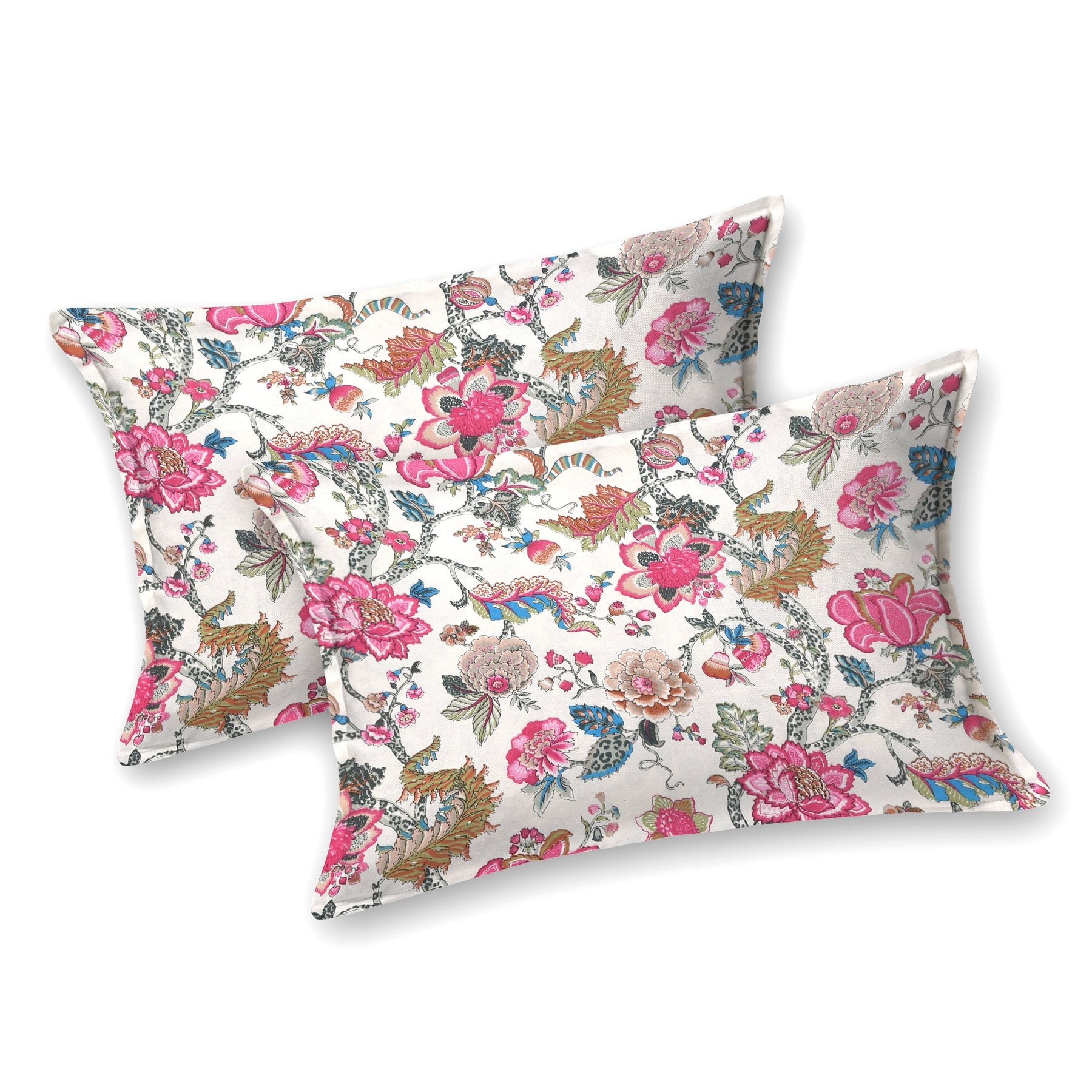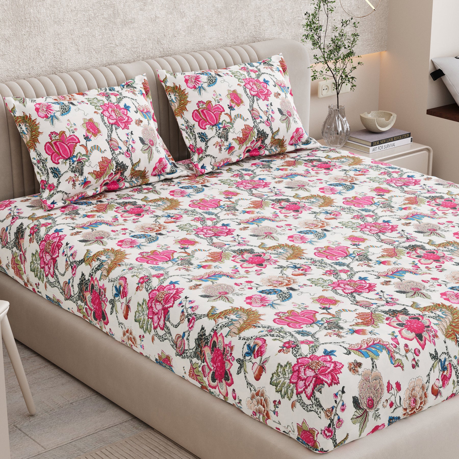 Double Fitted Bedsheet Set 100% Cotton with 2 Pillow Covers Floral Design Pink & Cream Colour - Scarlet Collection