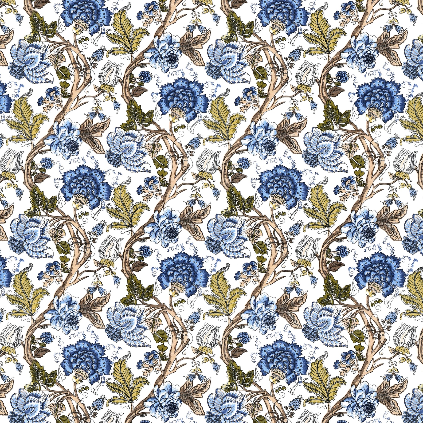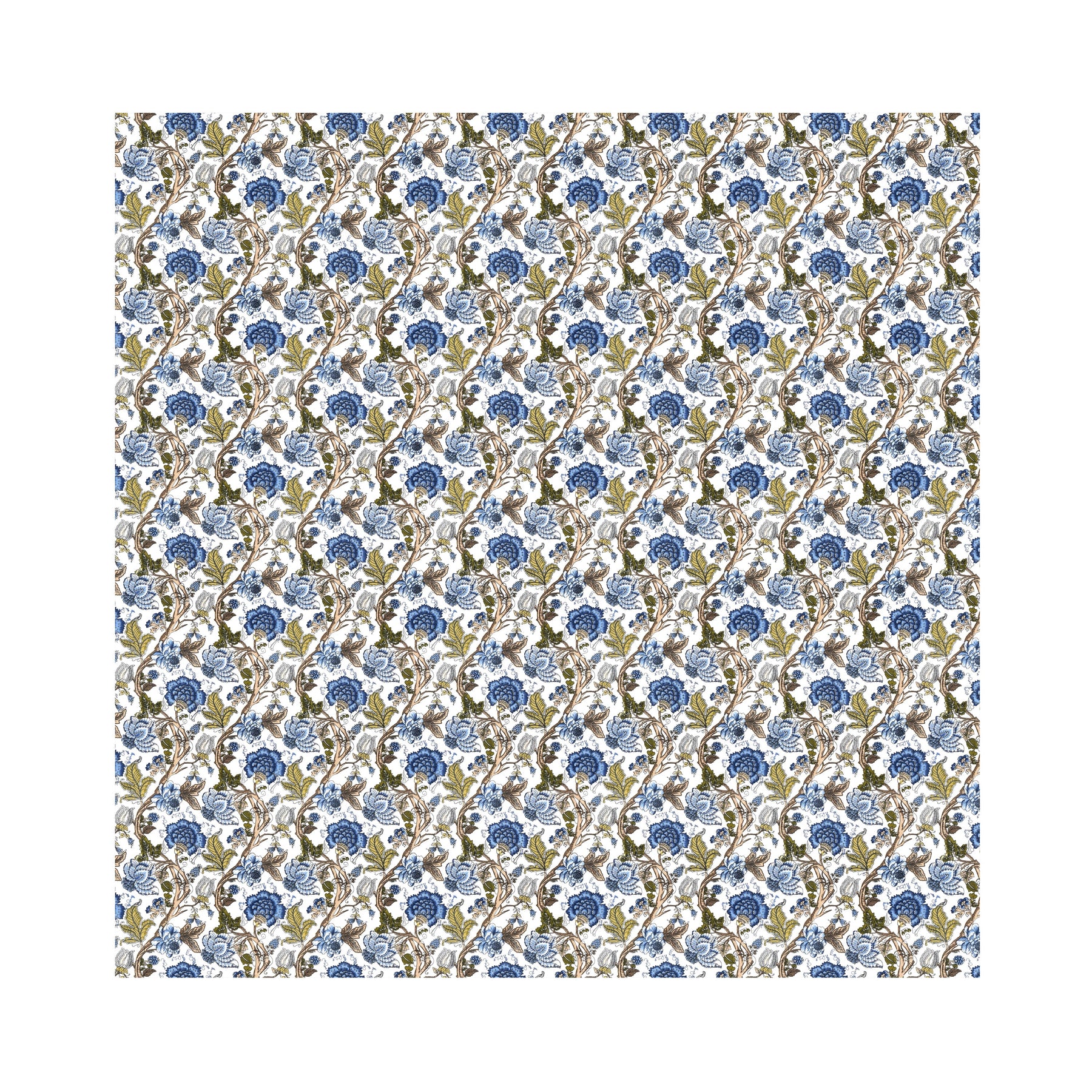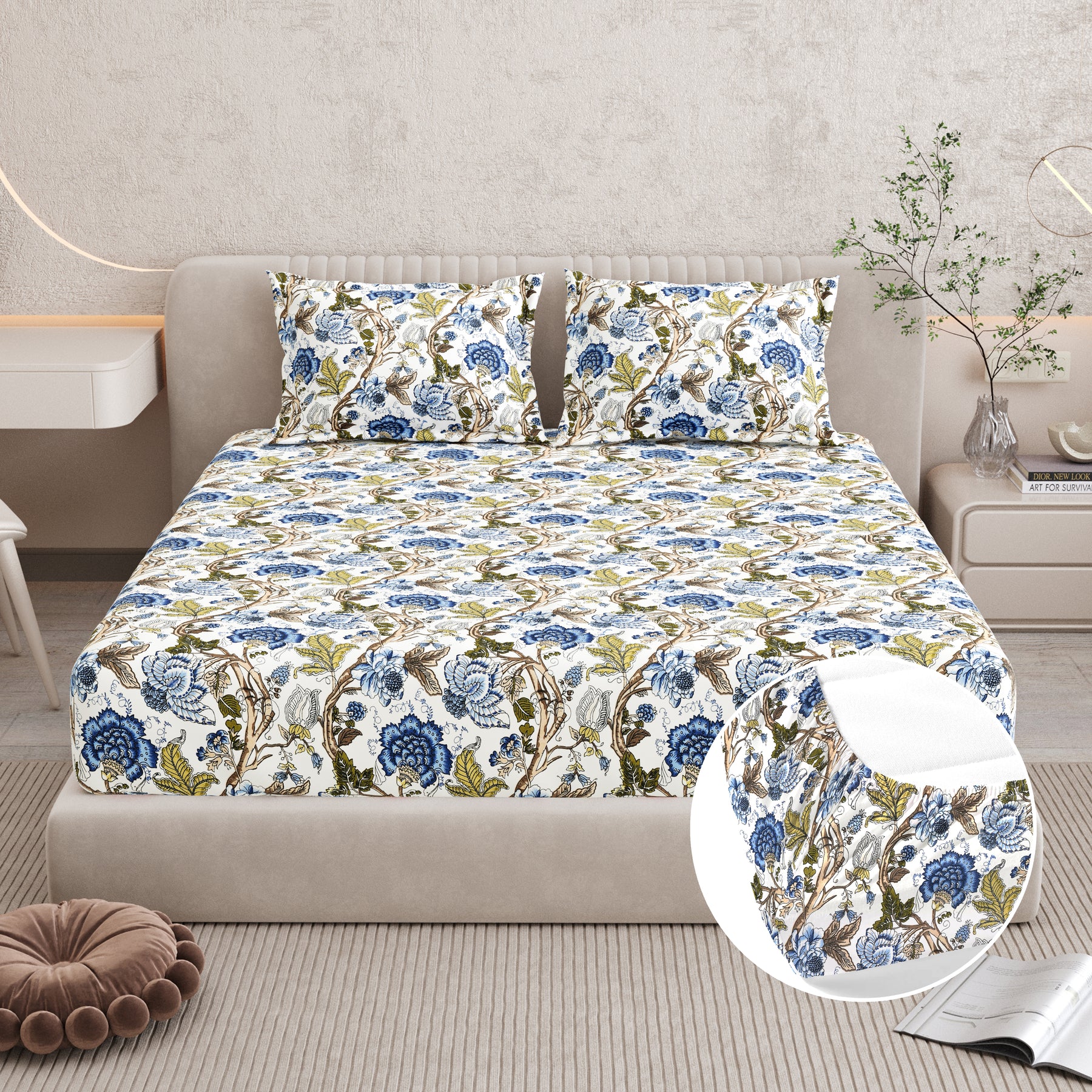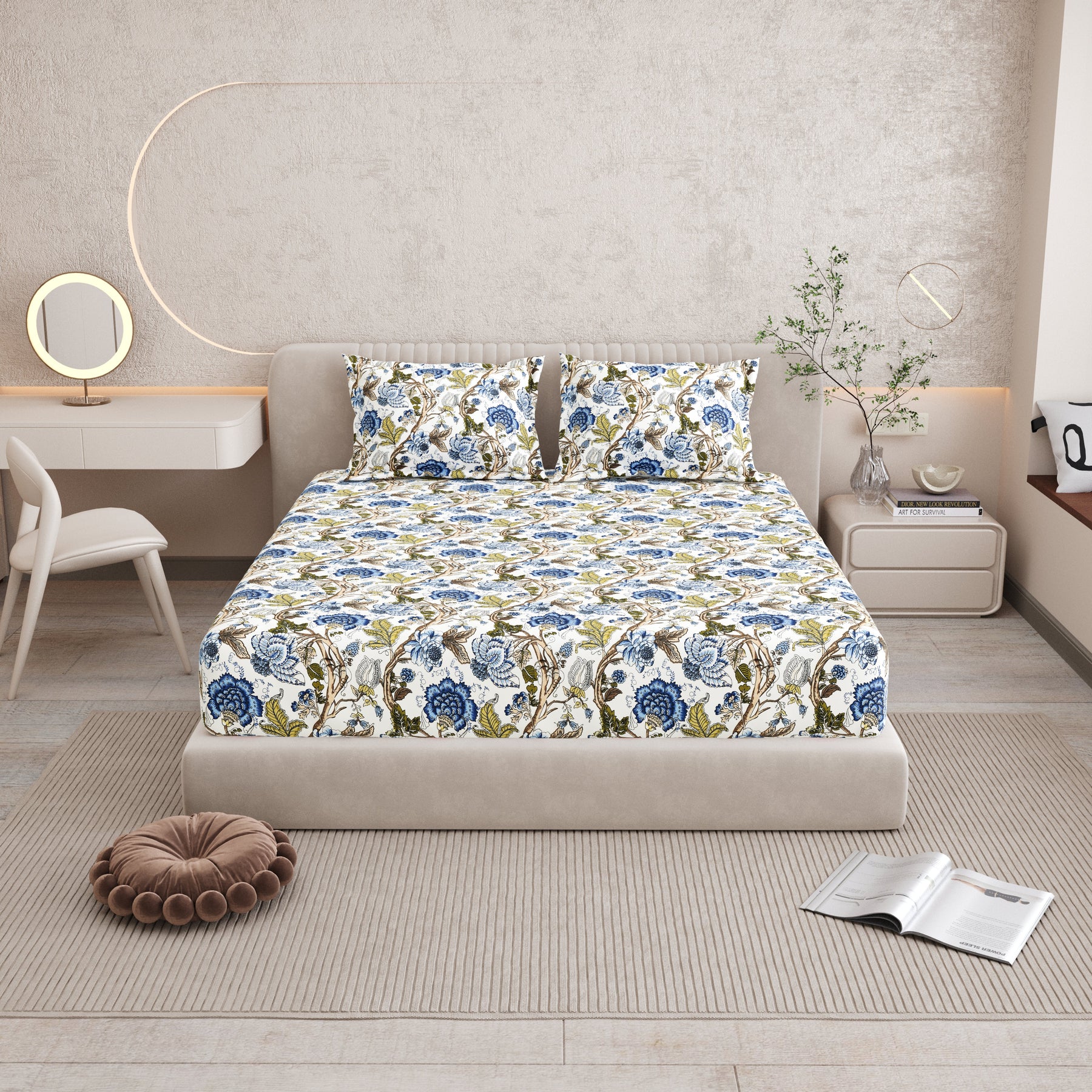 Double Fitted Bedsheet Set 100% Cotton with 2 Pillow Covers Floral Design Royal Blue and Olive Green Colour - Scarlet Collection