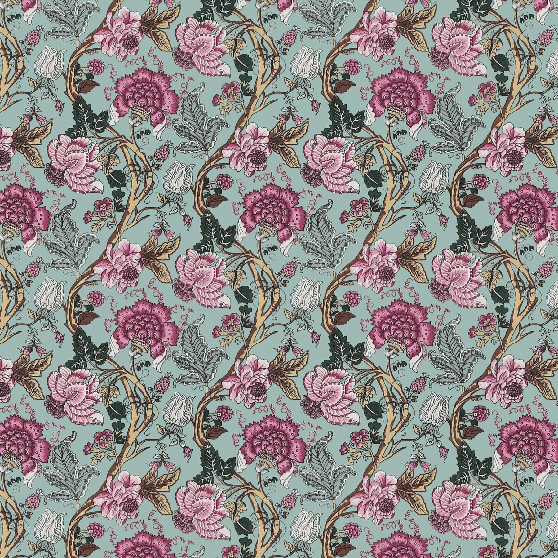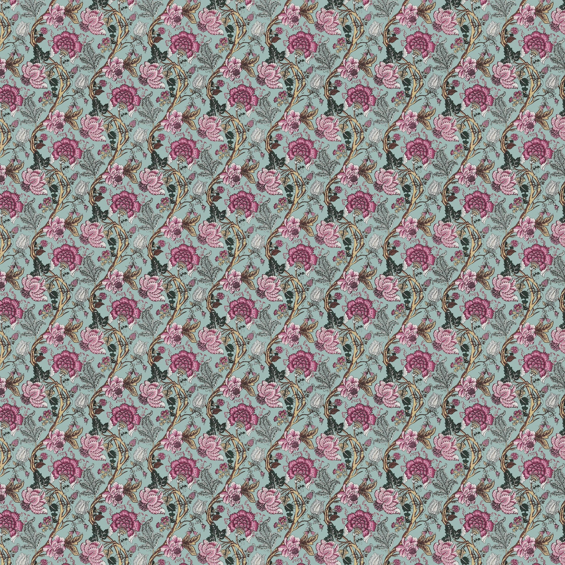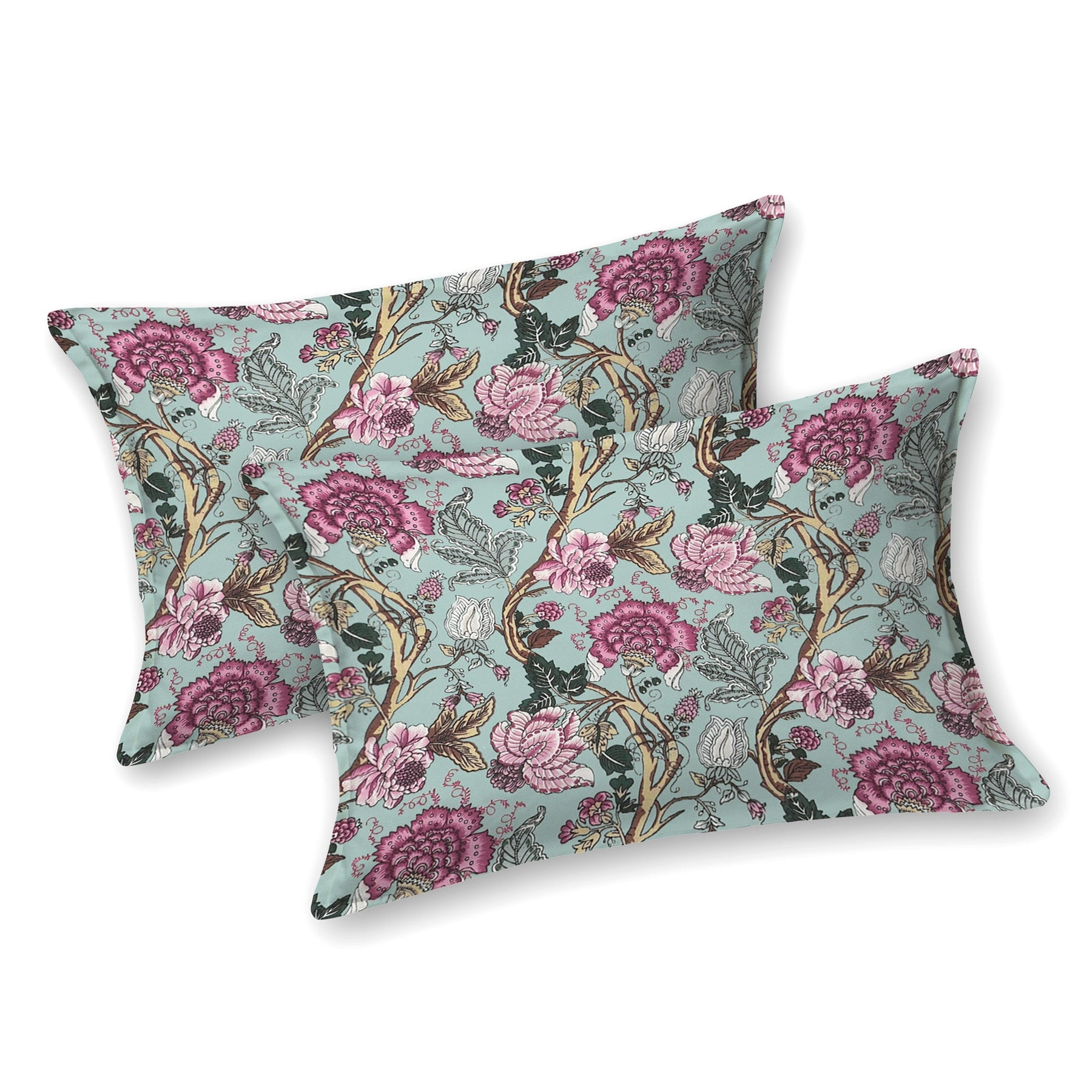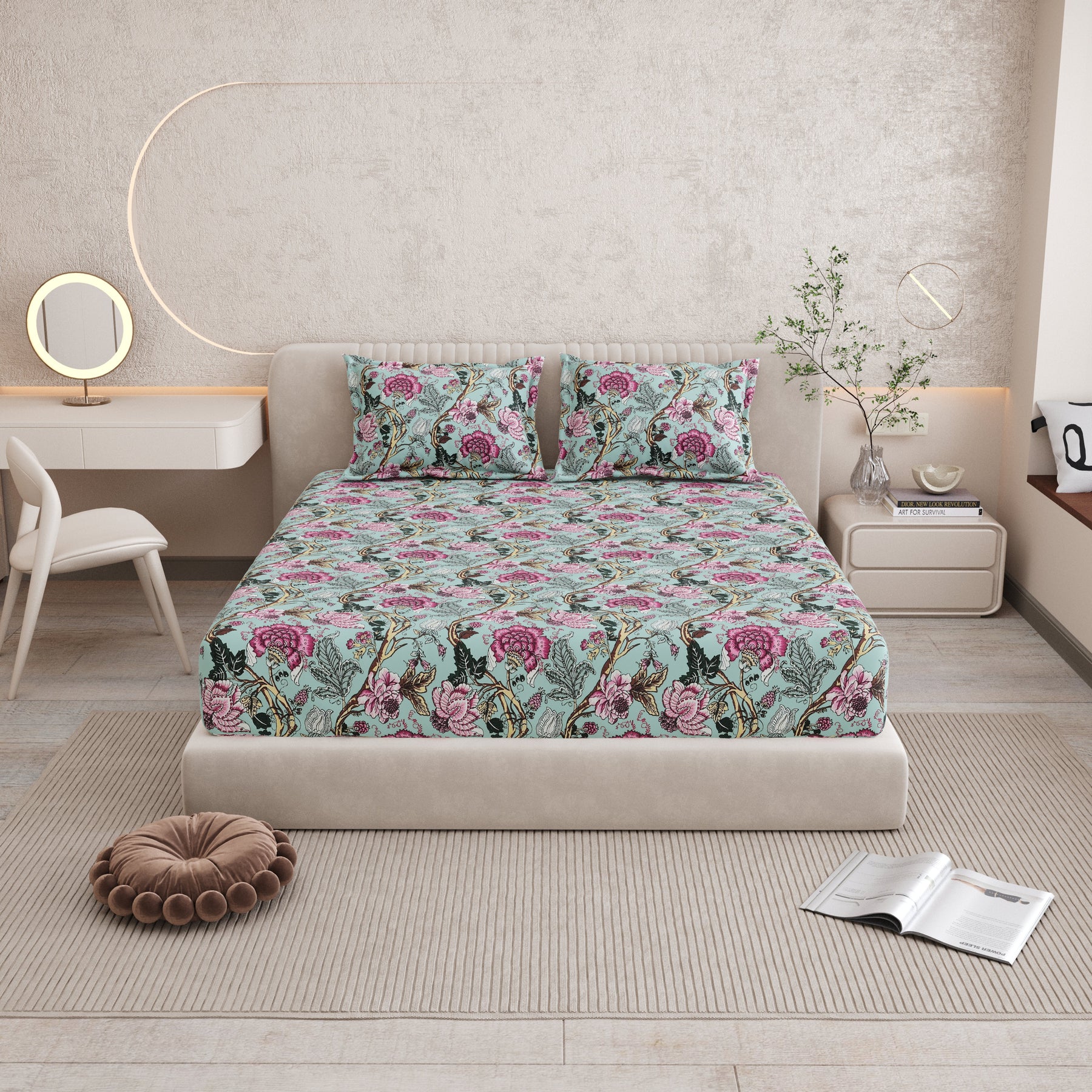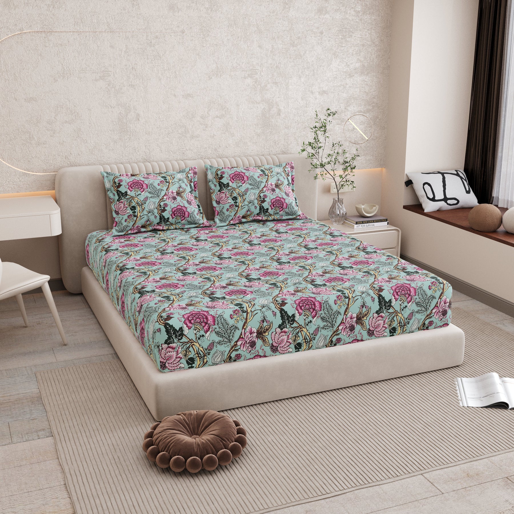 Double Fitted Bedsheet Set 100% Cotton with 2 Pillow Covers Floral Design Mint Green and Magenta Colour - Scarlet Collection