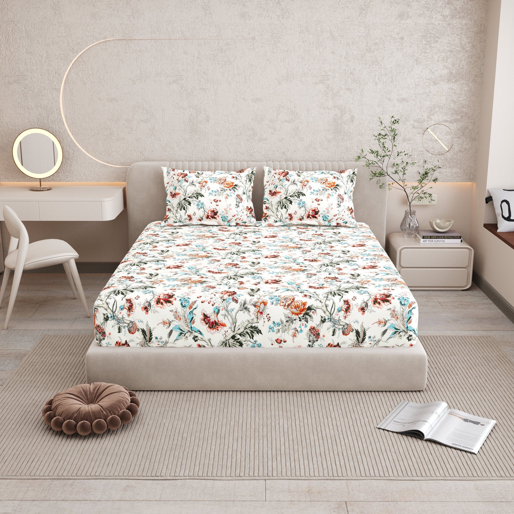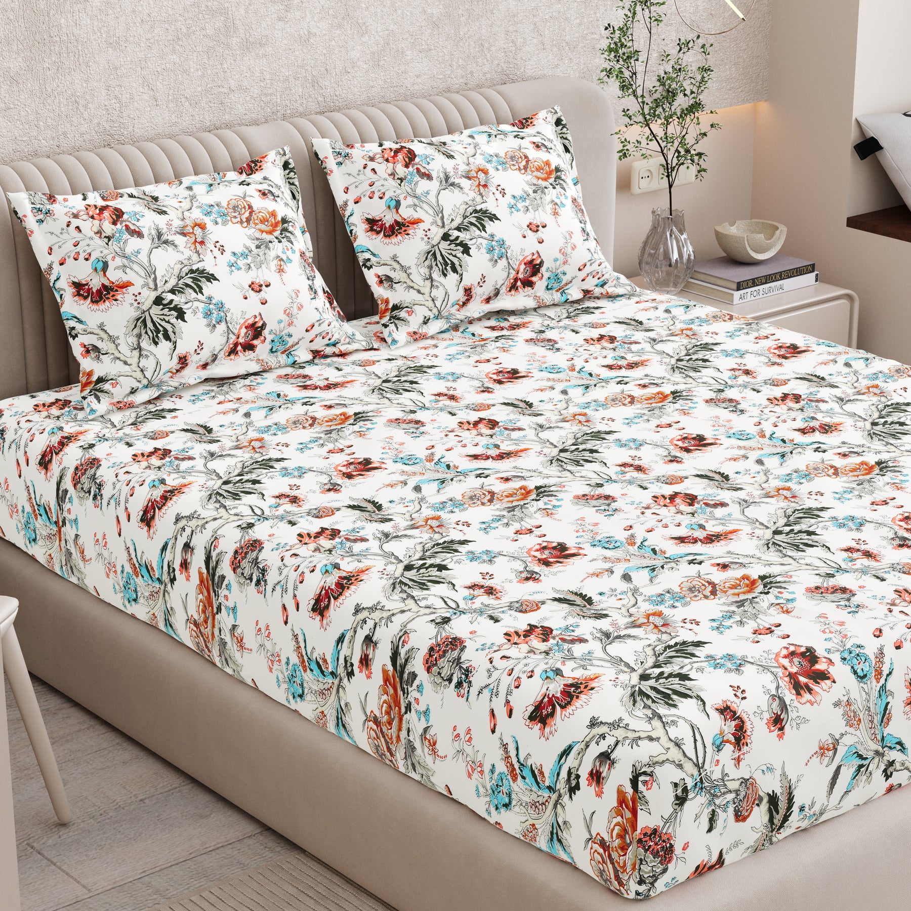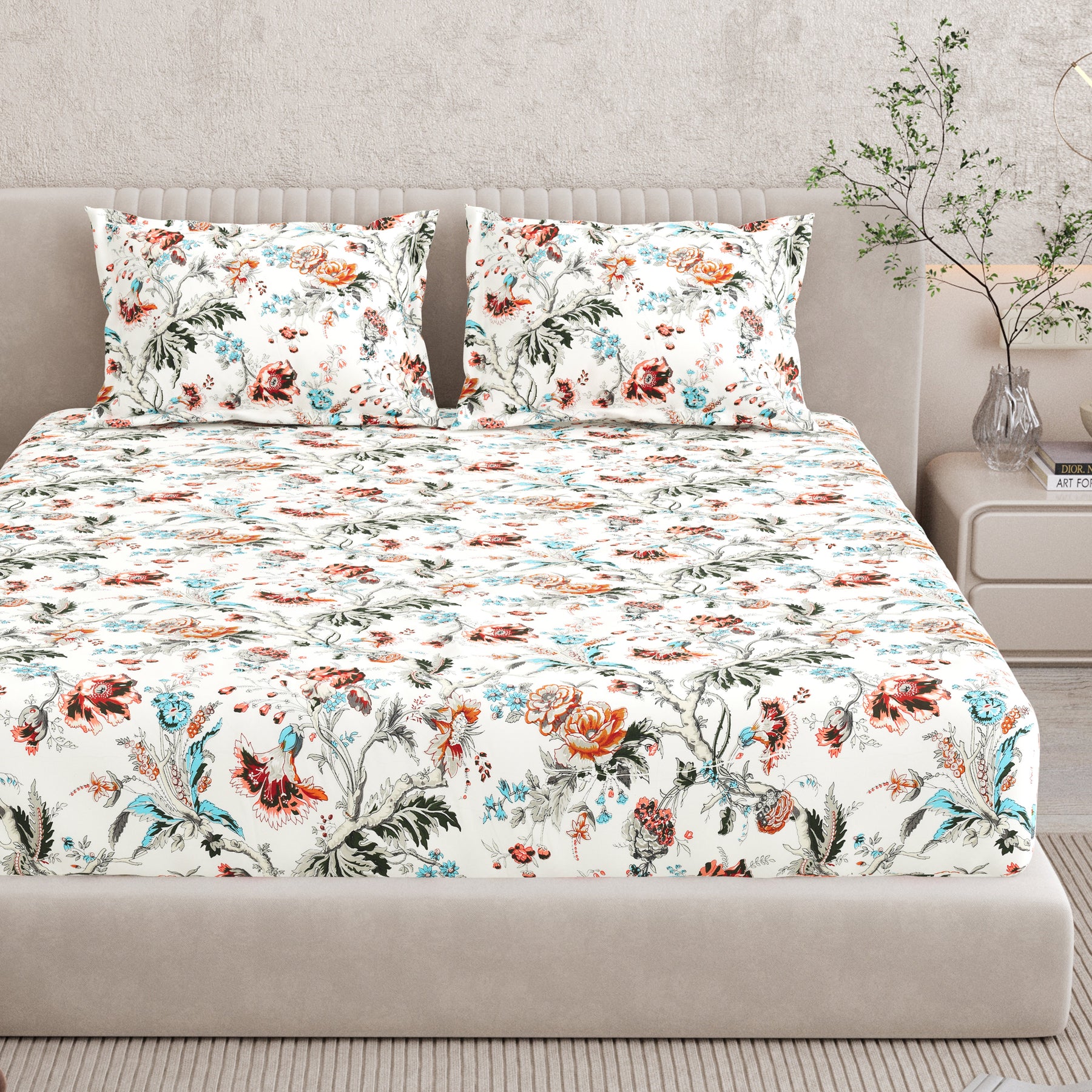 Double Fitted Bedsheet Set 100% Cotton with 2 Pillow Covers Floral Design Multi Colour - Scarlet Collection