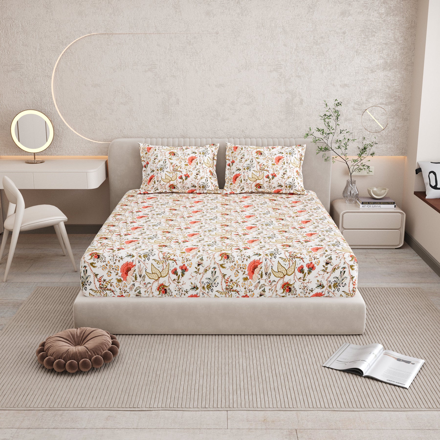 Double Fitted Bedsheet Set 100% Cotton with 2 Pillow Covers Floral Design Multi Colour - Scarlet Collection